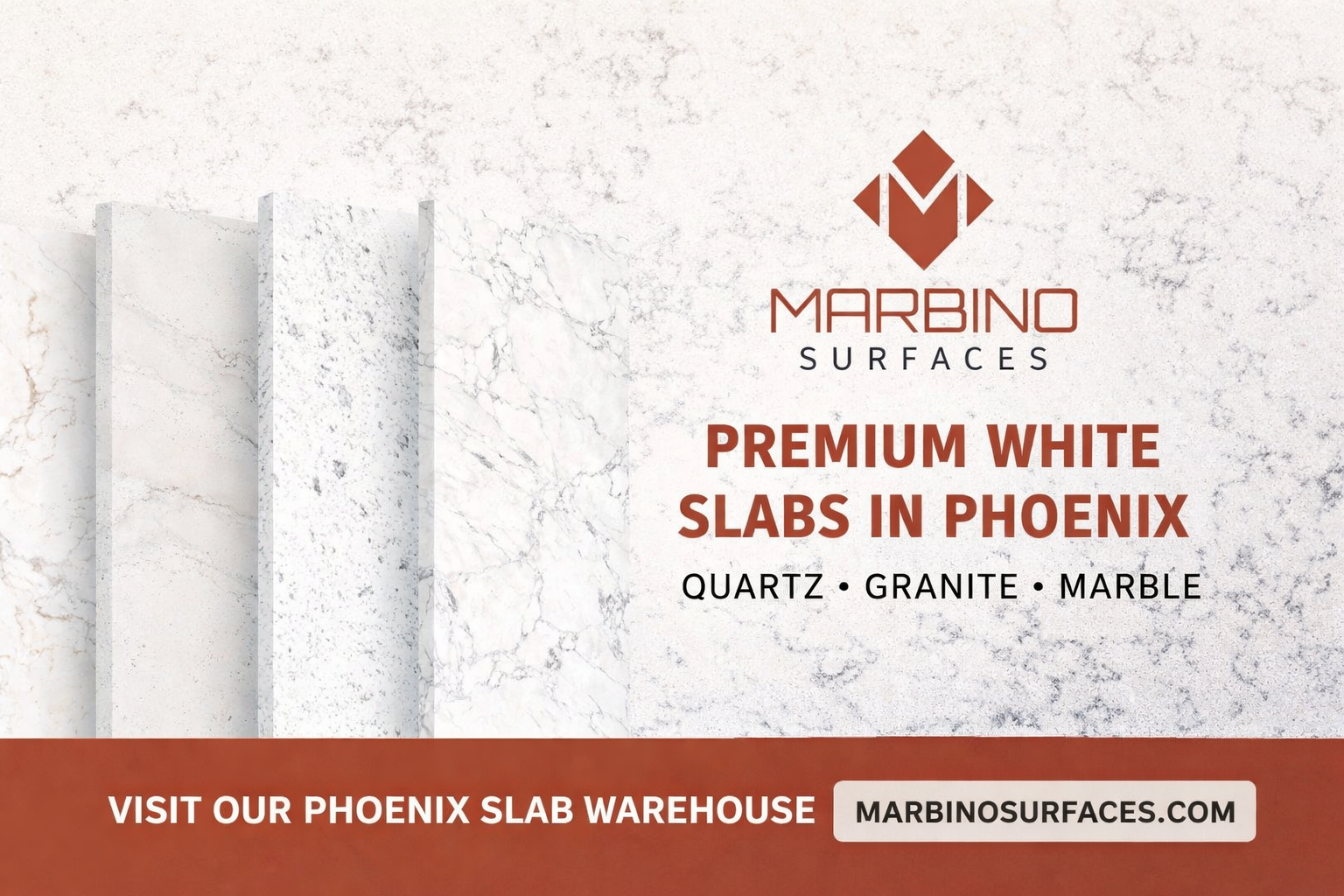 Marbino Surfaces is a leading Quartz slab supplier in Phoenix, offering a large in-stock selection of premium Quartz slabs for kitchen countertops, bathroom vanities, and commercial projects. Our showroom features a wide variety of colors and styles, including popular white Quartz and marble-look designs.